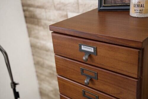 ●木目調の引出しにアンティーク調金具がついたお洒落なチェスト。