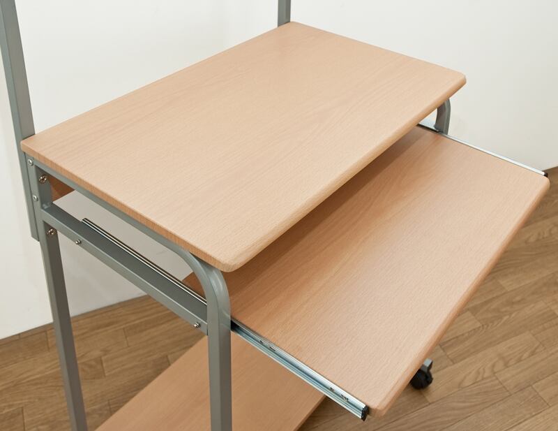 プリンターなどは上段の棚に、キーボードはスライドテーブルに、小物やソフトは下段の棚などに収納できます